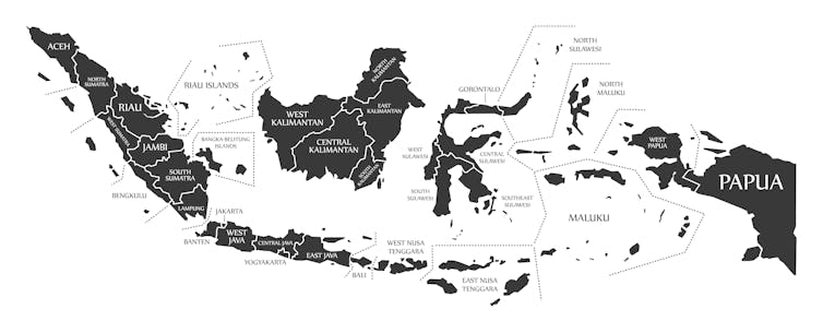 A map of Indonesia: the provinces of Papua and West Papua are on the far right of the map.